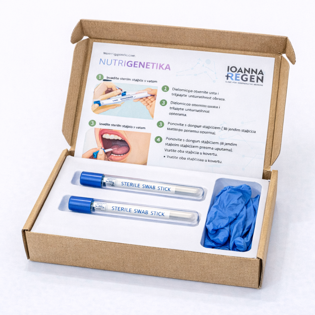 Nakon narudžbe, na Vašu adresu šaljemo nutrigenetički DNA kit za jednostavno i bezbolno uzimanje uzorka putem brisa unutrašnje strane obraza. Uzorak nam vraćate poštom, a laboratorij provodi detaljnu analizu genetskih varijanti relevantnih za metabolizam i prehranu.